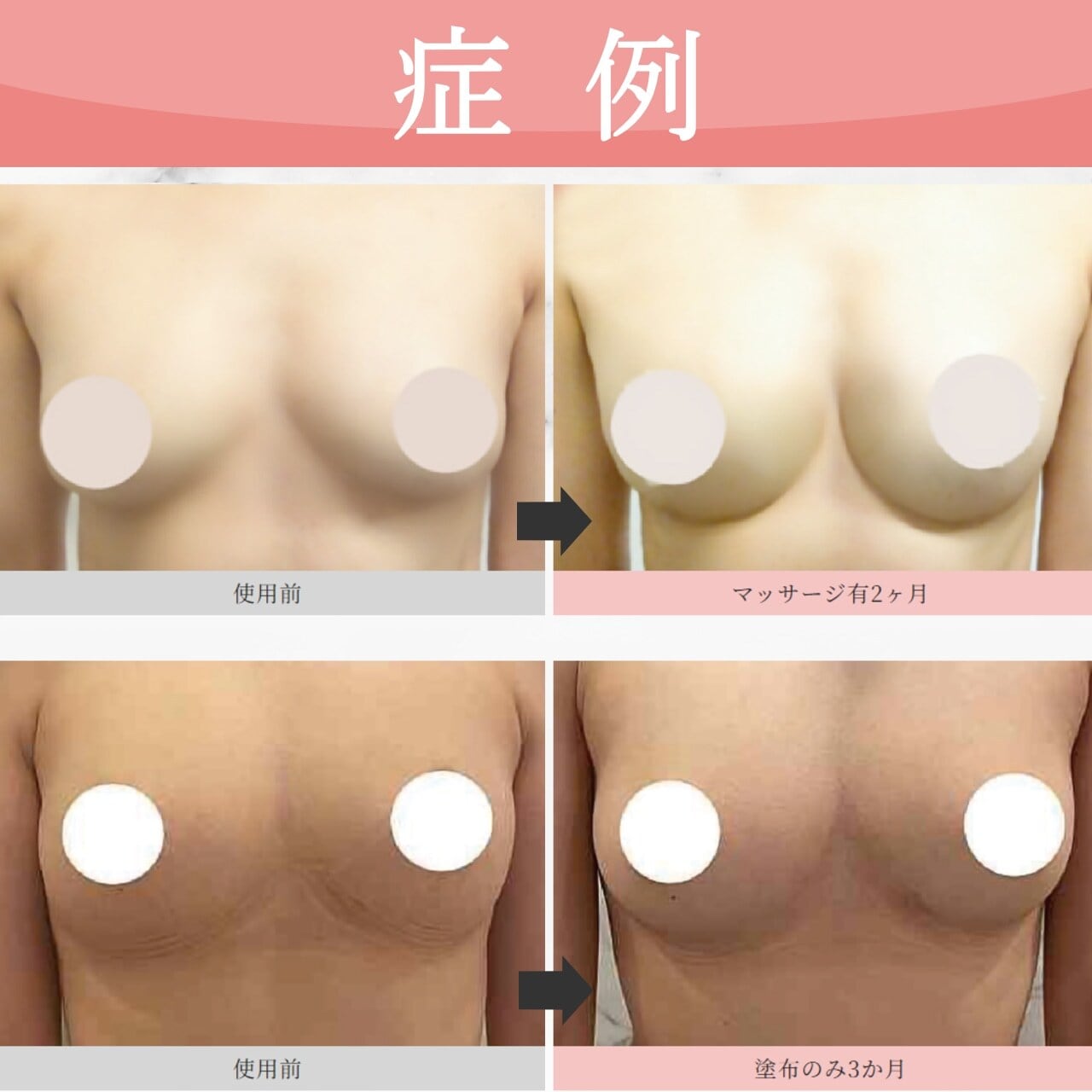 このたった一つの独自成分だけでボリューム(乳腺・脂肪細胞へダブルアタックし、他にないバストの再構築&ふっくらボリューム感を実現)、バストライン形成(バストを支えるクーパー靭帯を強化し、重力抵抗を高め美しい形のお胸に導く)、女性ホルモン活性化、ハリ・弾力UP(ヒアルロン酸生成や女性ホルモン活性など真皮の構造を強化し、ハリや弾力をアップして若々しいバストに)、美肌、体質改善、バストトップの色見改善、立体感・ツヤの8つに働きかけることができる満足度の高い厳選された成分がバランス良く配合されており、肌にしっかりと浸透し、ふっくらとした美しいラインを実現します。心地よいテクスチャーで、日々のケアが楽しみになるアイテムです。